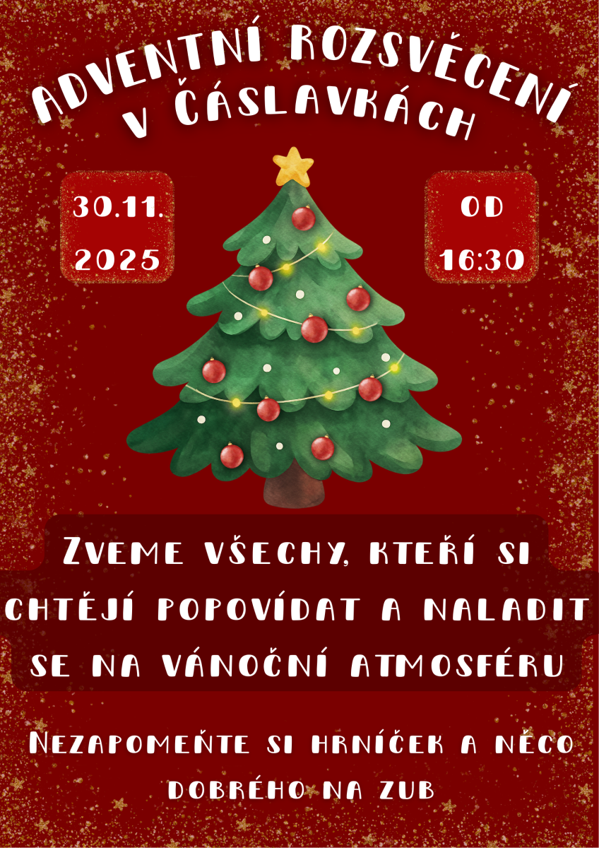 Zveme všechny na společné popovídání a naladění vánoční atmosféry na 1. adventní neděli 30.11. 2025 v 16:30 h v Čáslavkách na návsi u hasičárny.