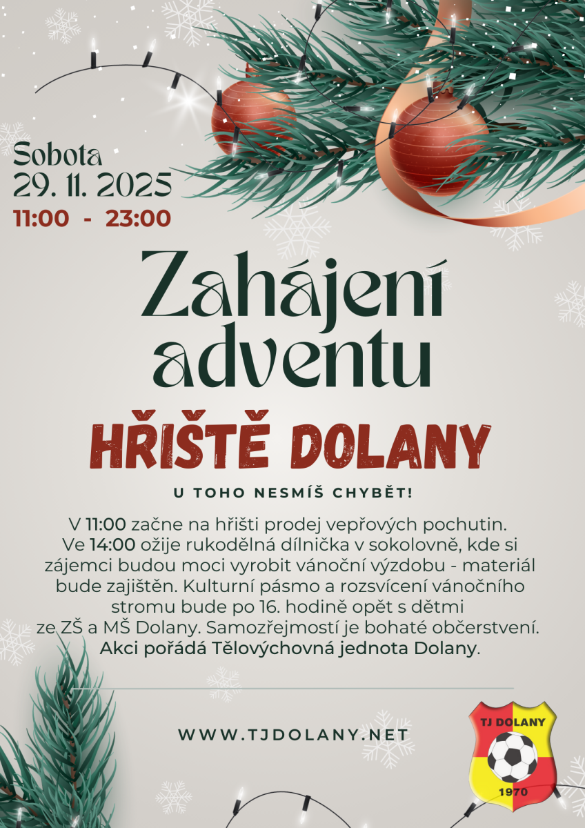 Ve 14:00 ožije rukodělná dílnička v sokolovně, kde si zájemci budou moci vyrobit vánoční výzdobu - materiál bude zajištěn. Kulturní pásmo a rozsvícení vánočního stromu bude po 16. hodině opět s dětmi ze ZŠ a MŠ Dolany. Samozřejmostí je bohaté občerstvení, Akci pořádá Tělovýchovná jednota Dolany.